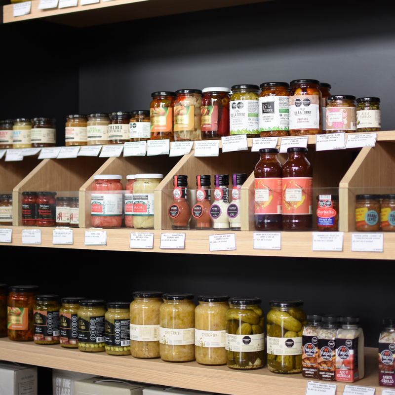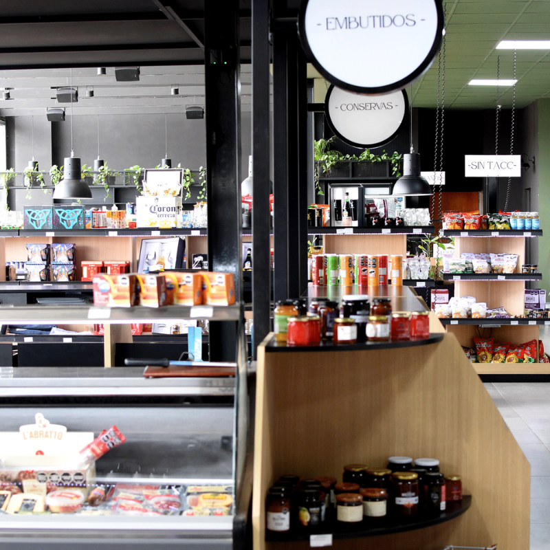 En la sección de delicatessen, se optó por mobiliario contrapared a medida con estantes de distintas medidas y alturas.
