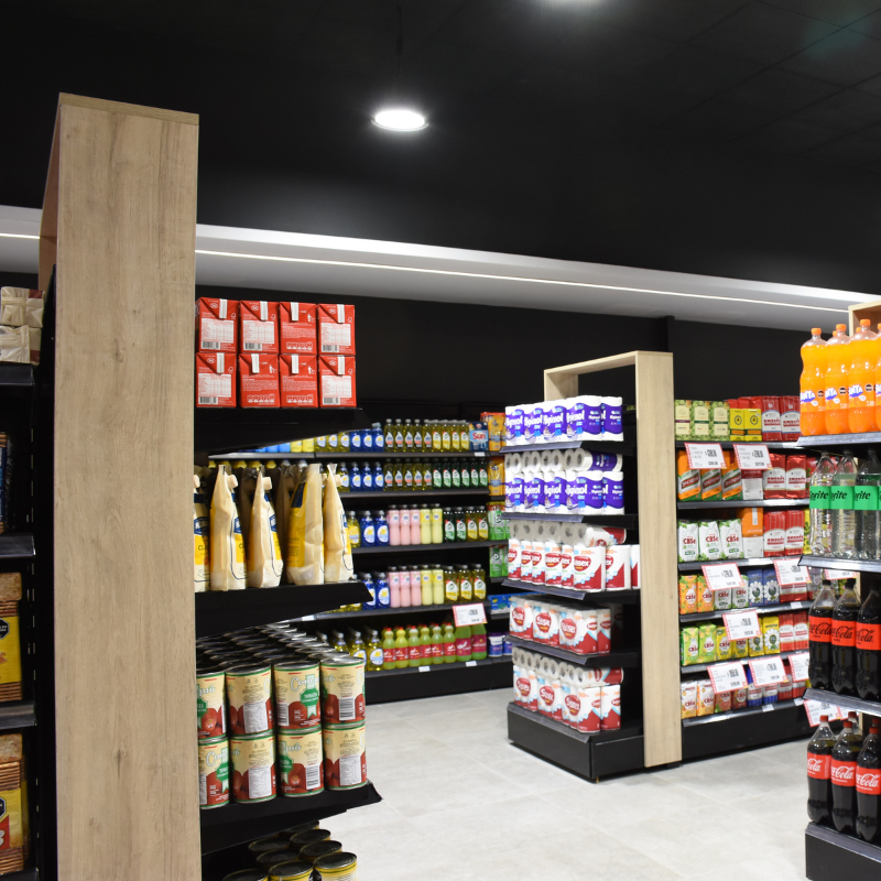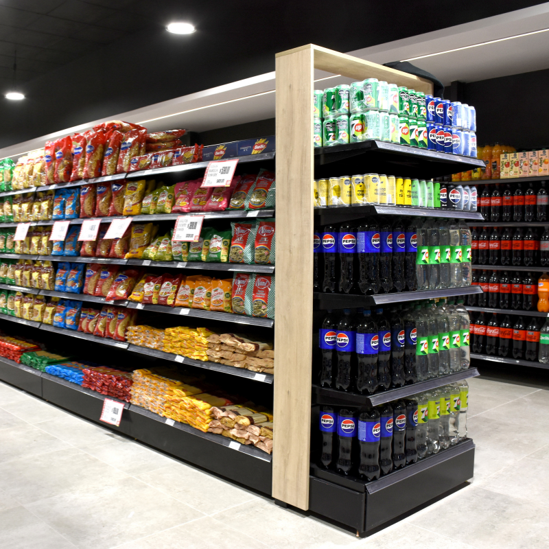 Instalamos góndolas centrales metálicas negras con detalles de madera en las punteras, lo que aporta una estética contemporánea y cálida. Asimismo, este contraste realza los productos y ordena visualmente cada sector. Las góndolas contrapared continúan esta línea, permitiendo así una mayor capacidad de exhibición y una lectura más clara de las categorías.
